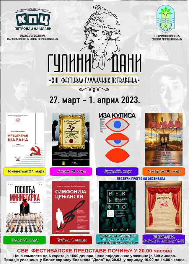 Karte, po ceni od 300 dinara, mogu se kupiti na biletarnici Kulturno – prosvetnog centra Petrovac na Mlavi, radnim danima od 10 do 14 časova. Sve festivalske predstave počinju u 20 časova. Generalni pokrovitelj 13. „Gulinih dana“ je Opština Petrovac na Mlavi.
