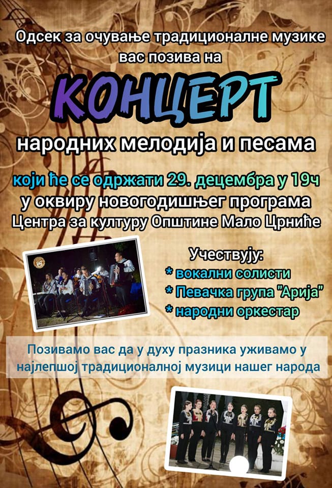 Centar za kulturu opštine Malo Crniće organizuje „Koncert narodnih melodija i pesama“, kao deo novogodišnjeg programa.