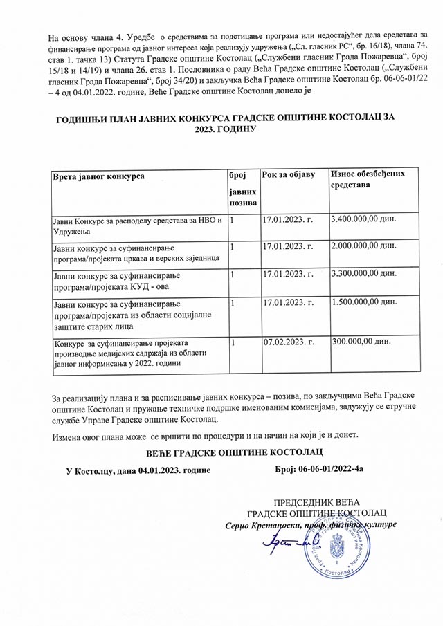 Veće Gradske opštine Kostolac je, na sednici održanoj 04.01.2023. godine, usvojilo godišnji plan javnih konkursa Gradske opštine Kostolac za 2023. godinu.