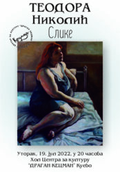 U utorak 19. jula u holu Centra za kulturu „Dragan Kecman“ u Kučevu sa početkom u 20 časova, biće otvorena izložba slika Teodore Nikolić, umetnice iz Beograda. Izložba se organizuje u okviru godišnjeg programa Galerije savremen umetnosti Kučevo.