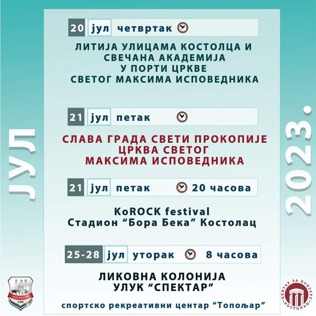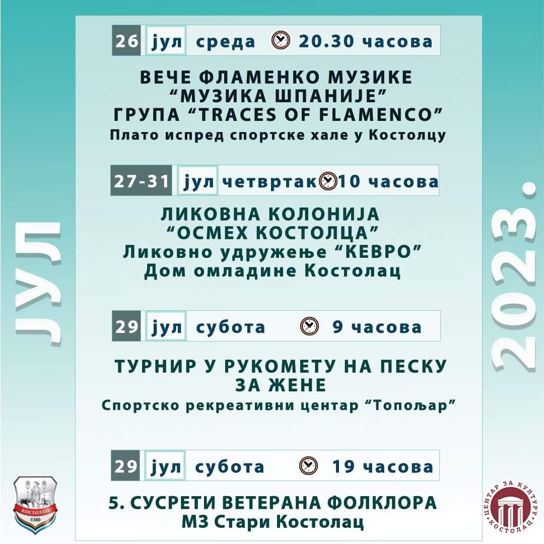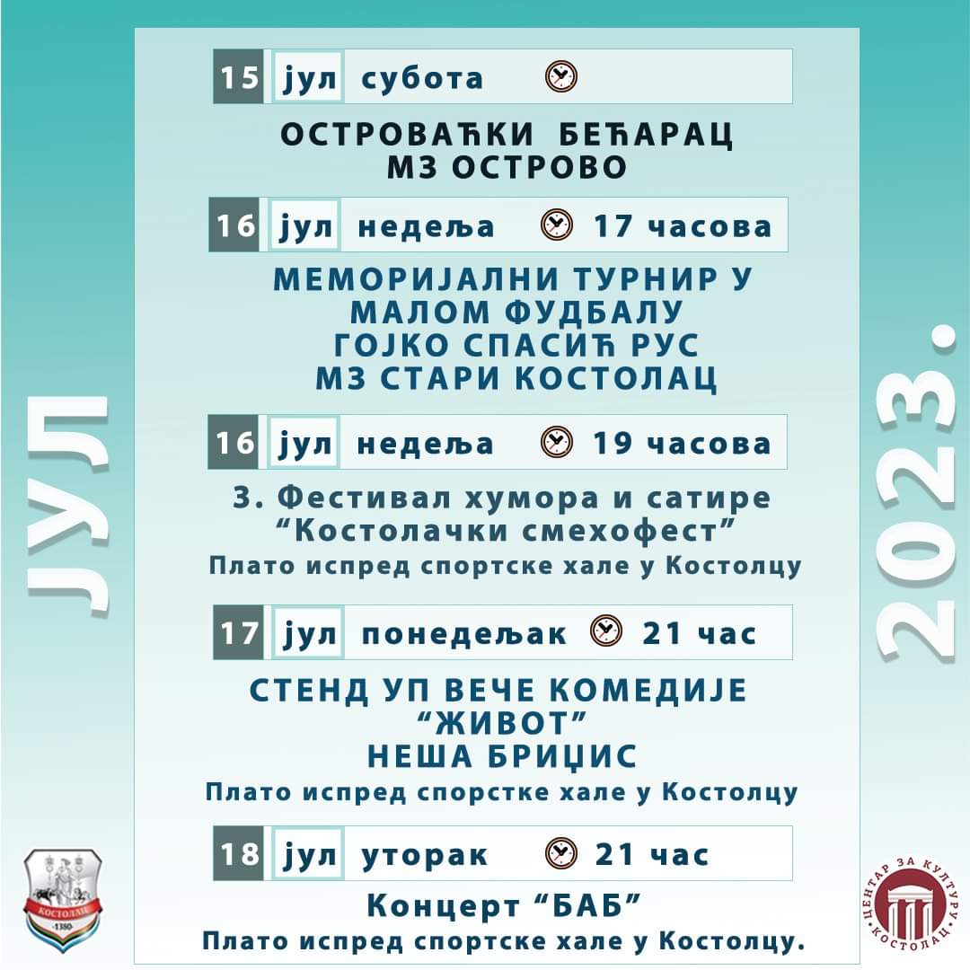 Centar za kulturu „Kostolac“ kao i svake godine organizuje manifestaciju „Kostolačko leto“ koja će trajati do 31. avgusta 2023. godine. U okviru manifestacije u julu mesecu možete pogledati predstave za decu i odrasle, muzičke koncerte, uživati u poeziji, predavanjima, likovnim kolonijama, festivalima i brojnim sportskim dešavanjima.
