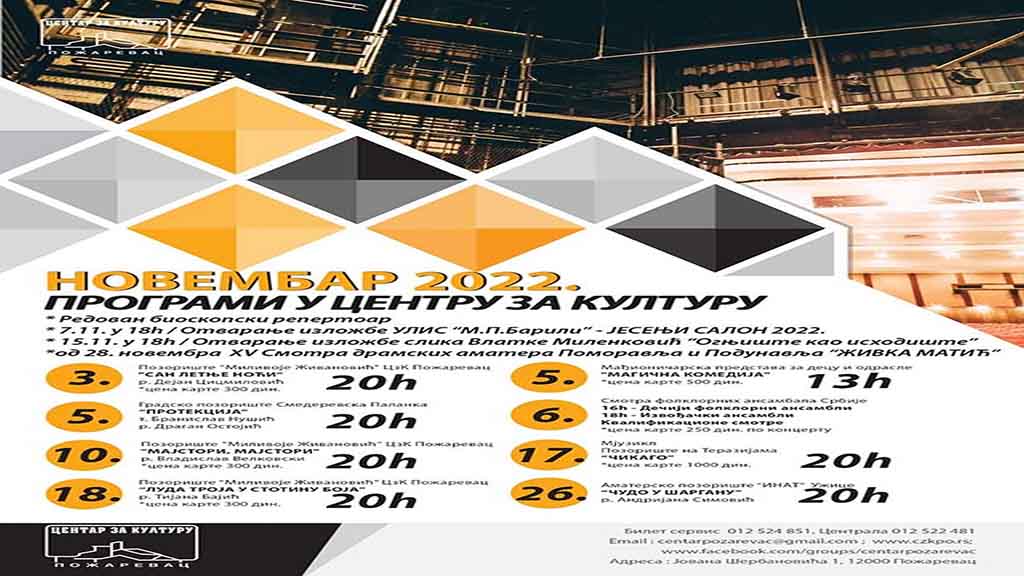 Centru za kulturu Požarevac, pripremio je bogat kulturno umetnički program za mesec novembar.