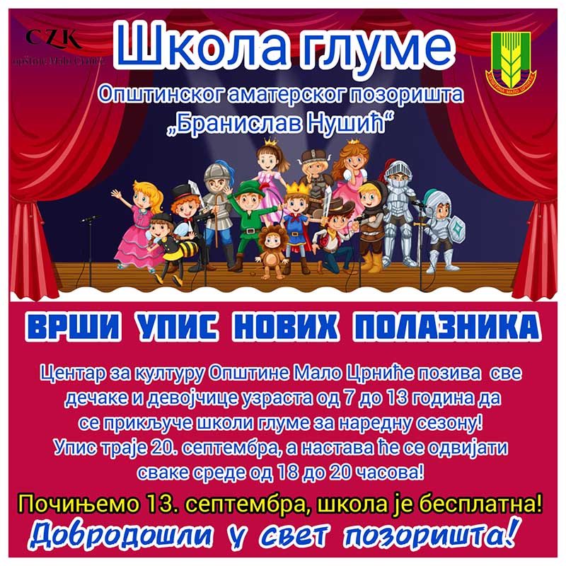 Centar za kulturu Opštine Malo Crniće poziva sve dečake i devojčice uzrasta od 7 do 13 godina, da se priključe školi glume za narednu sezonu. Upis će trajati do 20 septembra, a nastava će se odvijati svake srede od 18 do 20 časova. Škola glume je besplatna.
