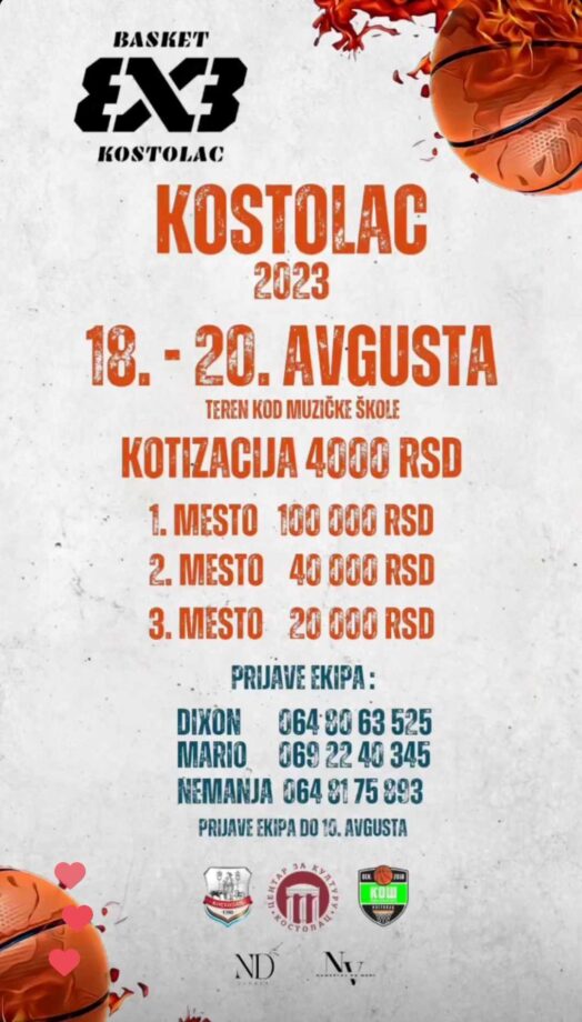 KK „Koš“ iz Kostolca u saradnji sa Centrom za kulturu „Kostolac“ pod pokroviteljstvom Gradske opštine Kostolac organizuje turnir u basketu 3×3 18., 19., i 20. avgusta 2023. na terenima kod Muzičke škole u Kostolcu.